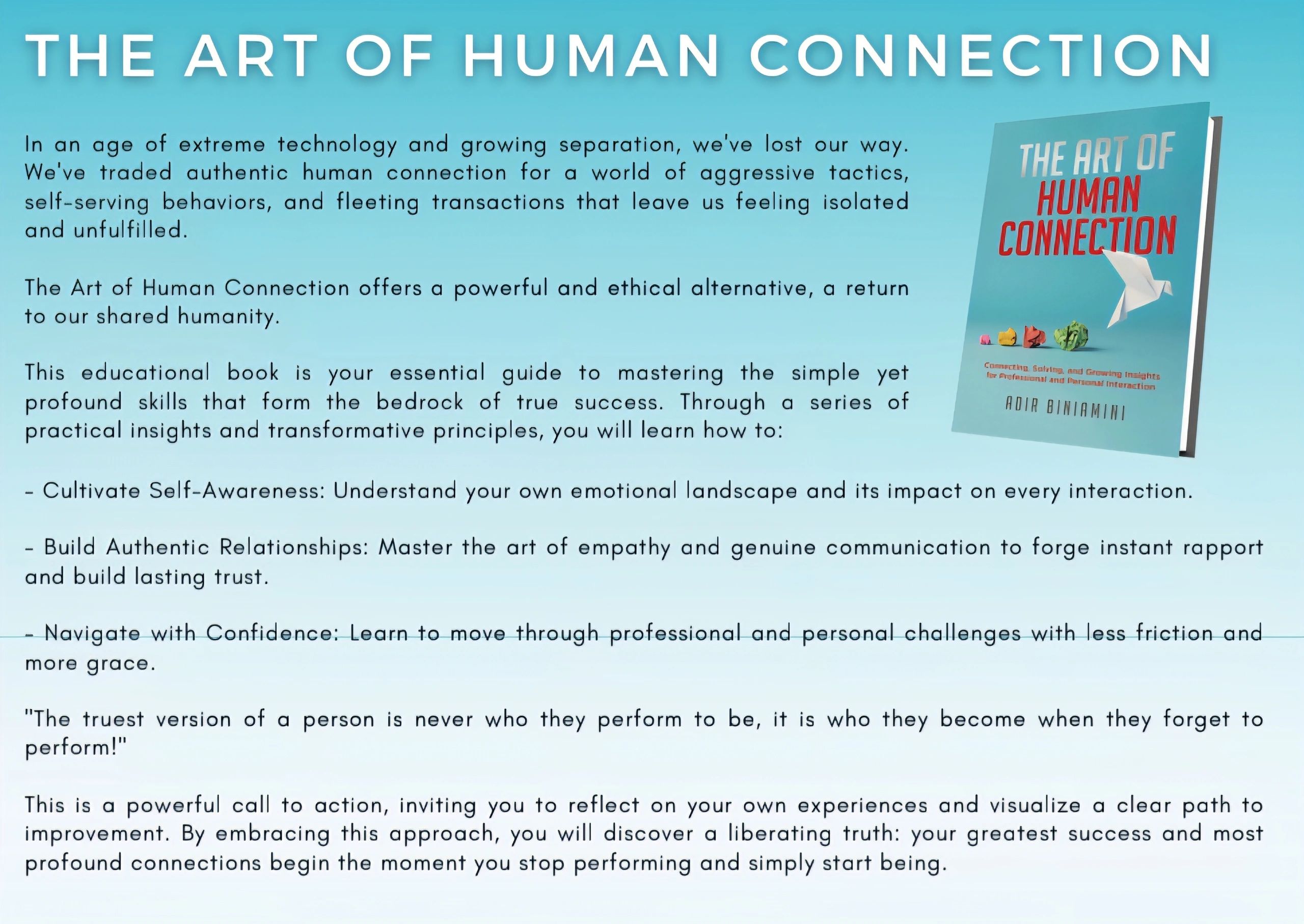 Adir Biniamini is the founder of Self Master Club Life Coaching and Sales Training, and the author of "The Art of Human Connection." Following a long and diverse entrepreneurial career, Adir now channels his passion for empowering individuals into coaching. His unique approach is built on a lifetime of experience and insights, guiding clients to unlock their full potential by mastering the essential skills of emotional intelligence, communication, and genuine rapport. Adir’s mission is to help clients move beyond superficial interactions and into a space of profound understanding, enabling them to navigate challenges, build trust, and find their purpose. His methodology is rooted in the belief that professional and personal fulfillment stems from a deep connection with ourselves and others, allowing clients to lead with empathy and create lasting success in every facet of their lives.